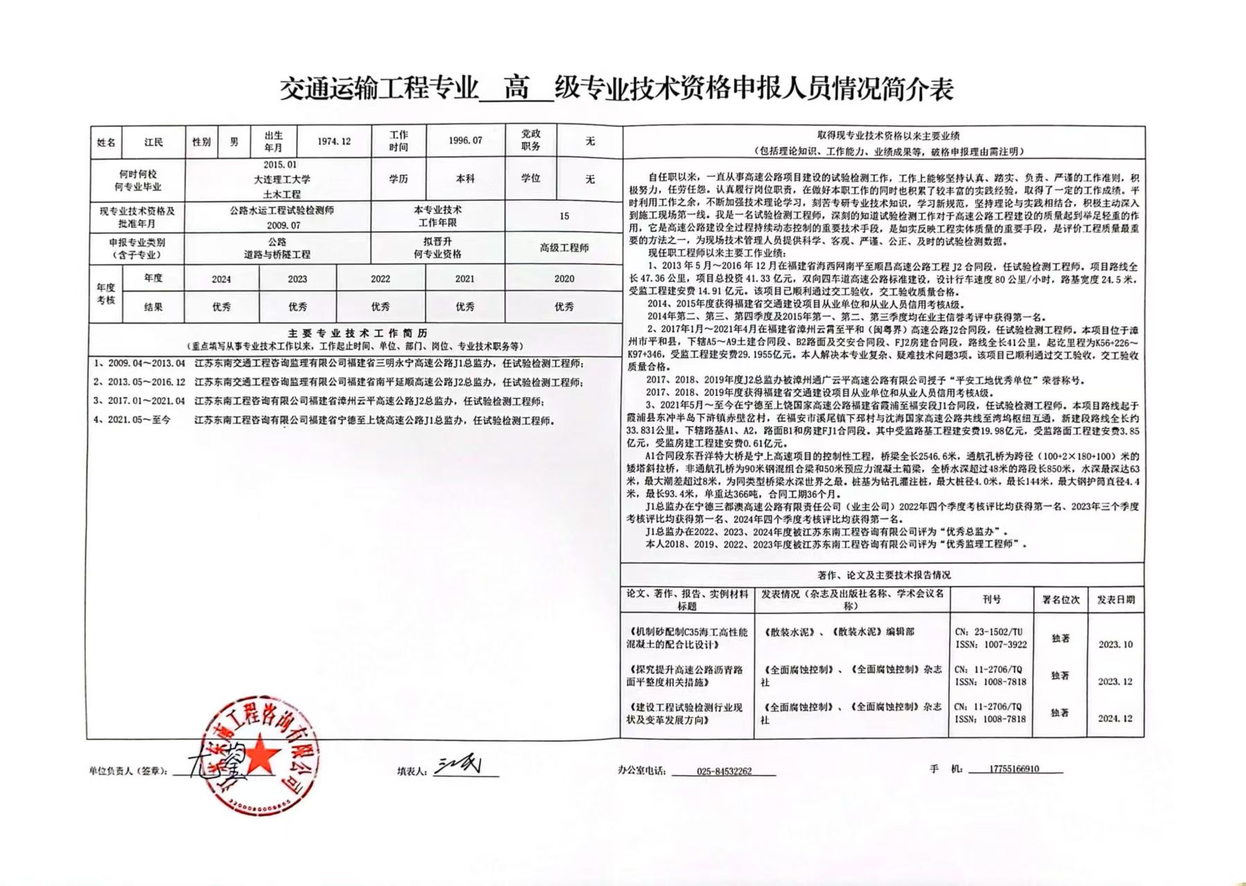 4、本人2017、2018、2019年參加福建省交通廳年度信用考核中被評(píng)為A級(jí)監(jiān)理試驗(yàn)室負(fù)責(zé)人,2018、2019、2022、2023年度榮獲江蘇東南工程咨詢有限公司頒發(fā)的“優(yōu)秀監(jiān)理工程師”稱(chēng)號(hào)。